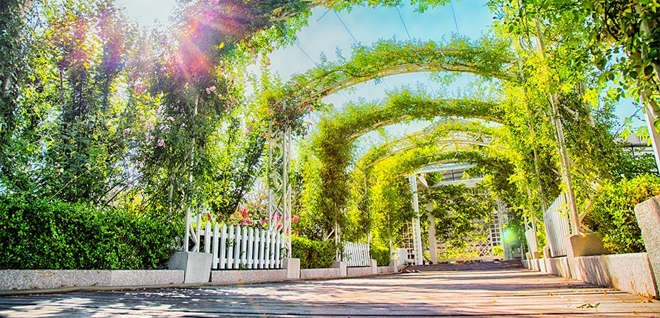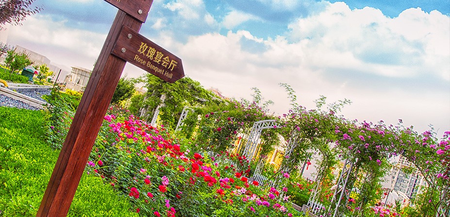 六楼玫瑰宴会厅藏身于满目青翠,郁郁葱葱,环境优雅的空中玫瑰花园。花园中百花齐放、百鸟争鸣,随手便是一张风景美照。这里曲径通幽,一步一景,宛若世外桃源;这里静谧悠闲,闲庭漫步,随享城市静谧;这里浪漫幽静,鸟语花香,尊享纷杂生活中难得的休憩与放松。