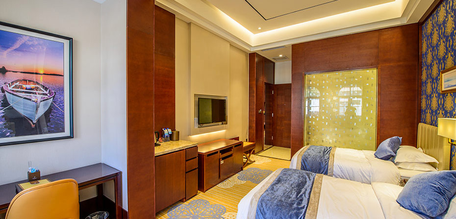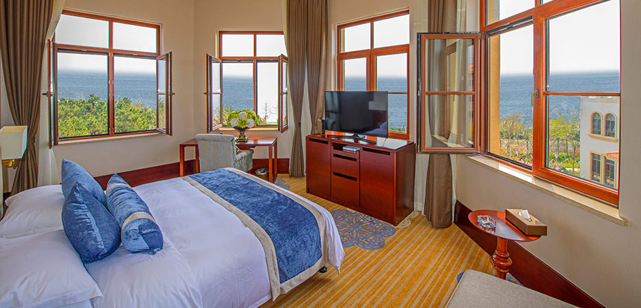 6号楼为酒店主楼,共4层,配套设施高档先进,现拥有中、高档客房58间,其中可用房为54间,(标准间41间,大床房6间,单人间7间),房间结构合理,面朝大海、南北通透,光线充足,让您尽情享受美好风景;房内布置温馨舒适,整洁大方,设有空调、数字电视、电话、免费宽带及无线网络,并提供24小时热水淋浴。我们将竭力为您打造家一般的感觉。
